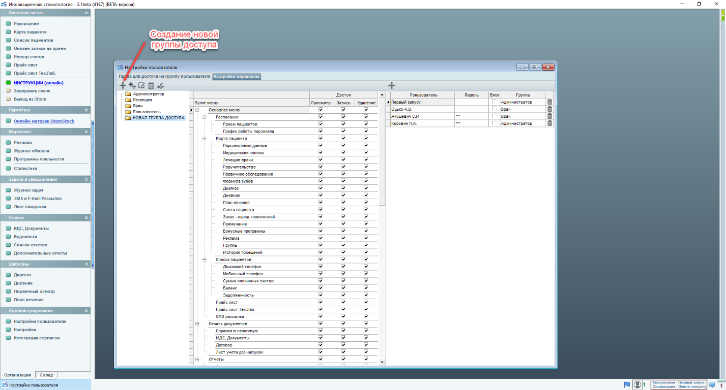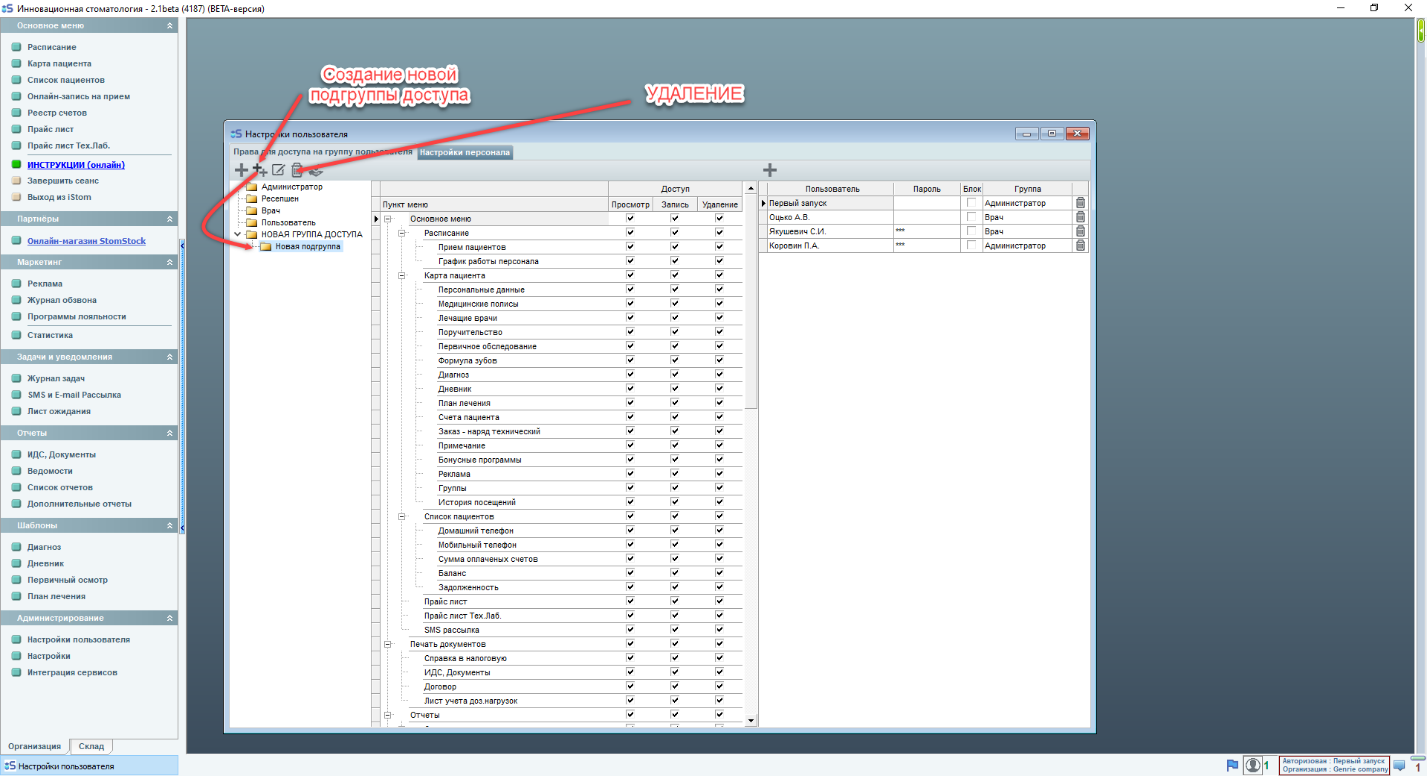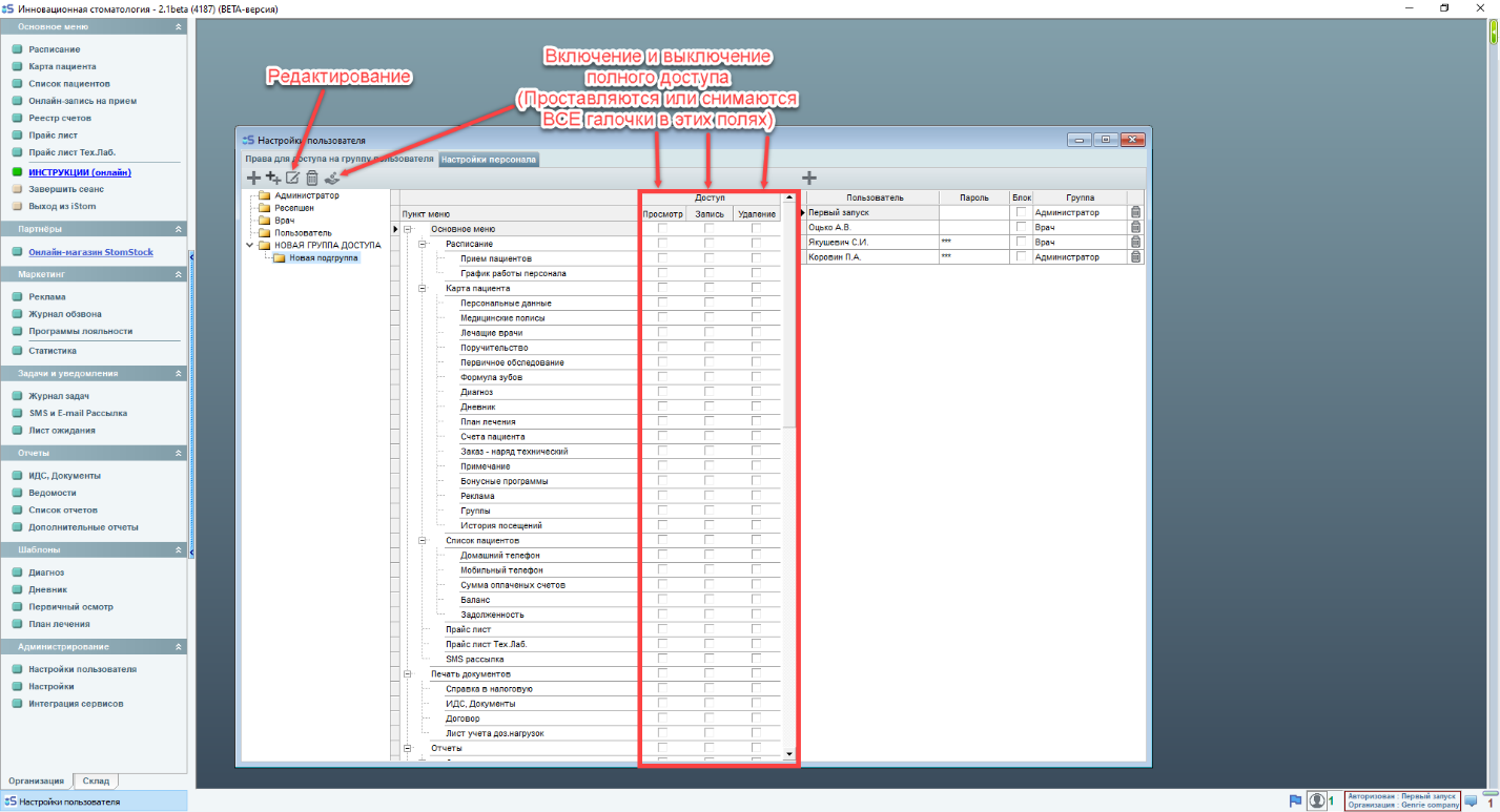 1) Администратор - это полный доступ ко всем зарплатам всех врачей, всей финансовой информации и любой имеющейся в iStom. (По умолчанию Администратор имеет право вносить\изменять\удалять данные почти во всех разделах программы)
