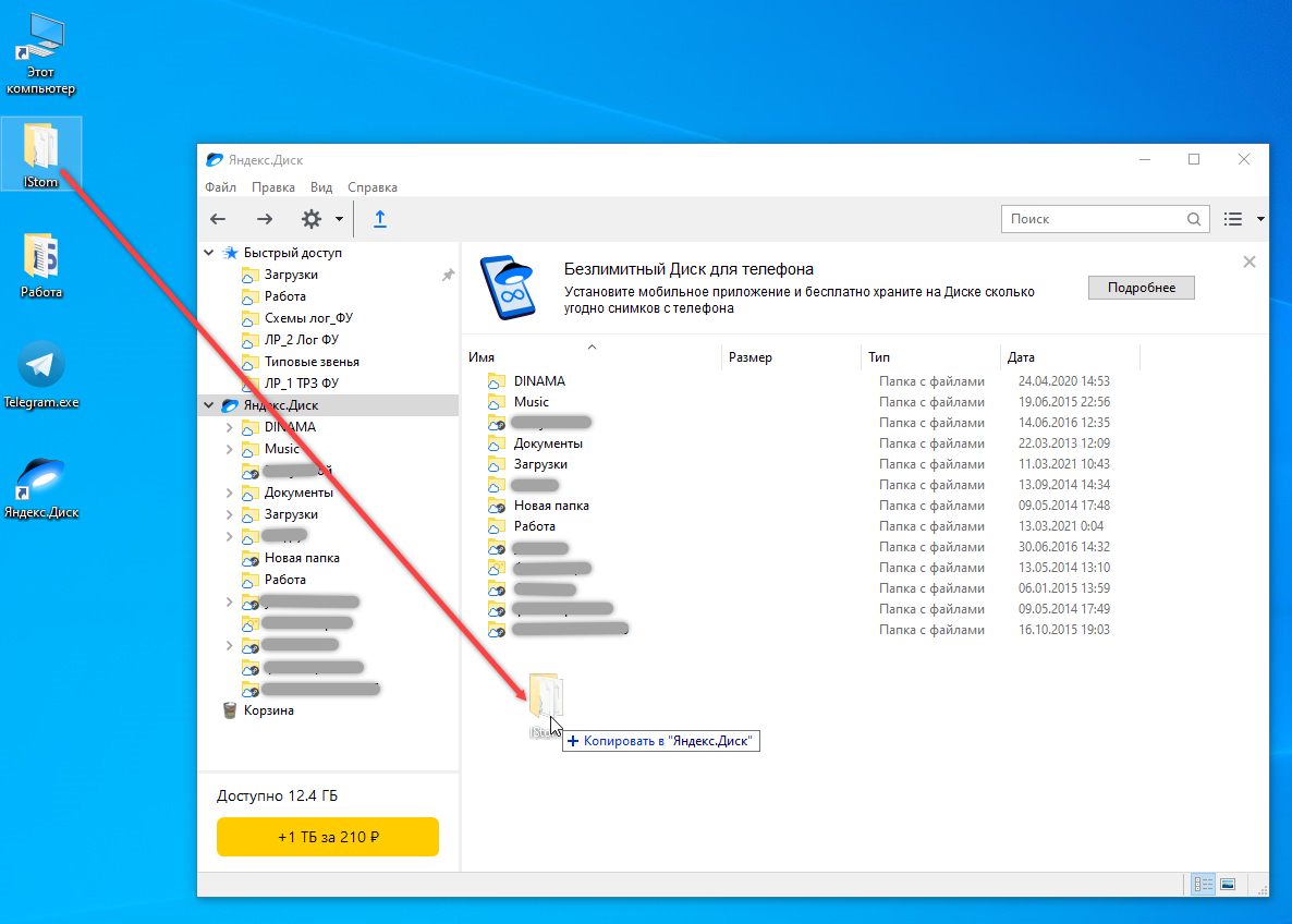 - Затем на том компьютере, на который ставили программу iStom, на рабочем столе находим ярлык программы, нажимаем правой кнопкой мыши на нём, затем "Расположение файла", открывается папка с программой, необходимо в проводнике нажать стрелочку назад \<-- на панели сверху, выйти из этой папки. Открыть окно Яндекс диска и проводник с папкой iStom и левой кнопкой мыши перетащить папку iStom в окно Яндекс диска, как показано на скриншоте (в моём случае папка находится на рабочем столе, у вас же она просто в другом месте - это не играет роли).