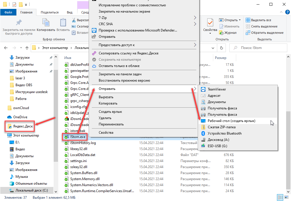 - (НА ВСЕХ КОМПЬЮТЕРАХ) Ждём пока загрузится папка на компьютер и после того открываем проводник, слева в проводнике жмём на папку Яндекс.Диск, заходим в папку IStom, находим файл iStom.exe, жмём на него правой кнопкой, "Отправить", "Рабочий стол (Создать ярлык)".