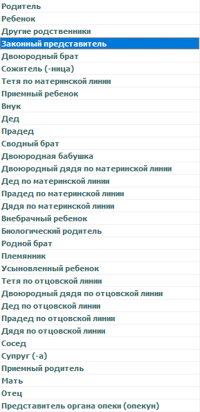 Полный список, доступных к выбору отношений к пациенту, показан на скриншоте ниже: