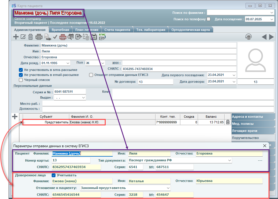 При вызове окна Параметров отправки данных в ЕГИСЗ из карты пациента имеющего поручителя автоматически заполняются поля как показано на картинке ниже: (Данные представителя автоматически заполняются в блоке "Доверенное лицо", данные подопечного – в блоке "Пациент" соответственно)