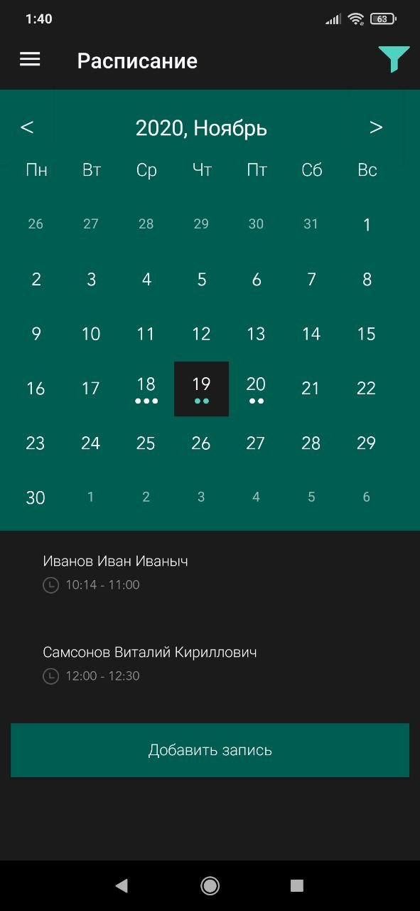 Тут вы можете посмотреть записи пациентов на любой день, а также записать новых, нажав на кнопку «Добавить запись» под расписанием.