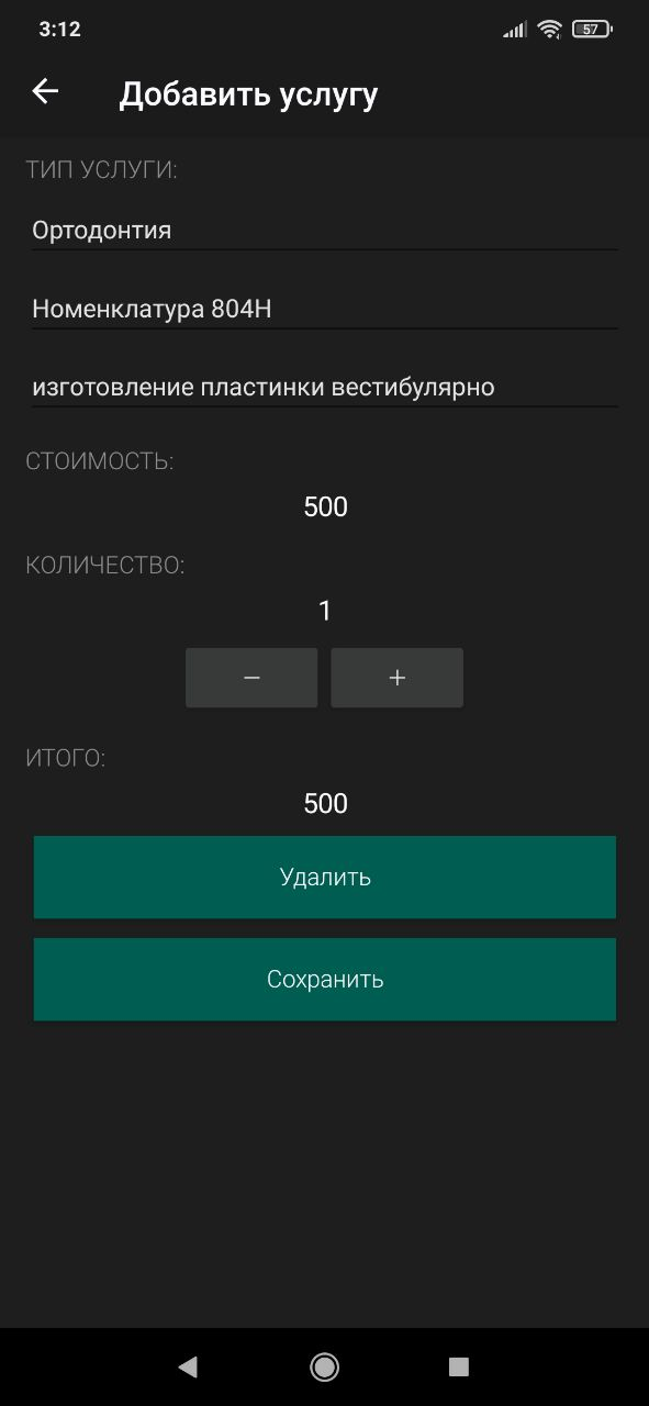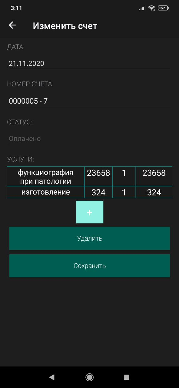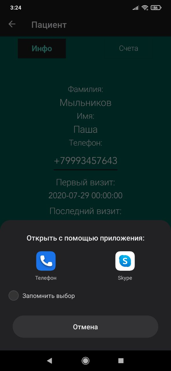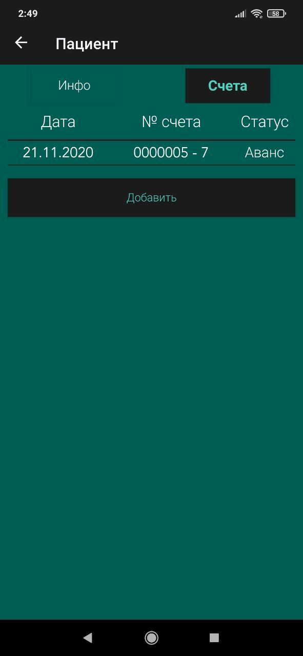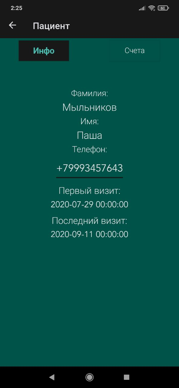 Нажав, на интересующего пациента, можем посмотреть его личную информацию, а также его счета. Нажав на номер пациента в его личной информации открывается приложение для звонка.