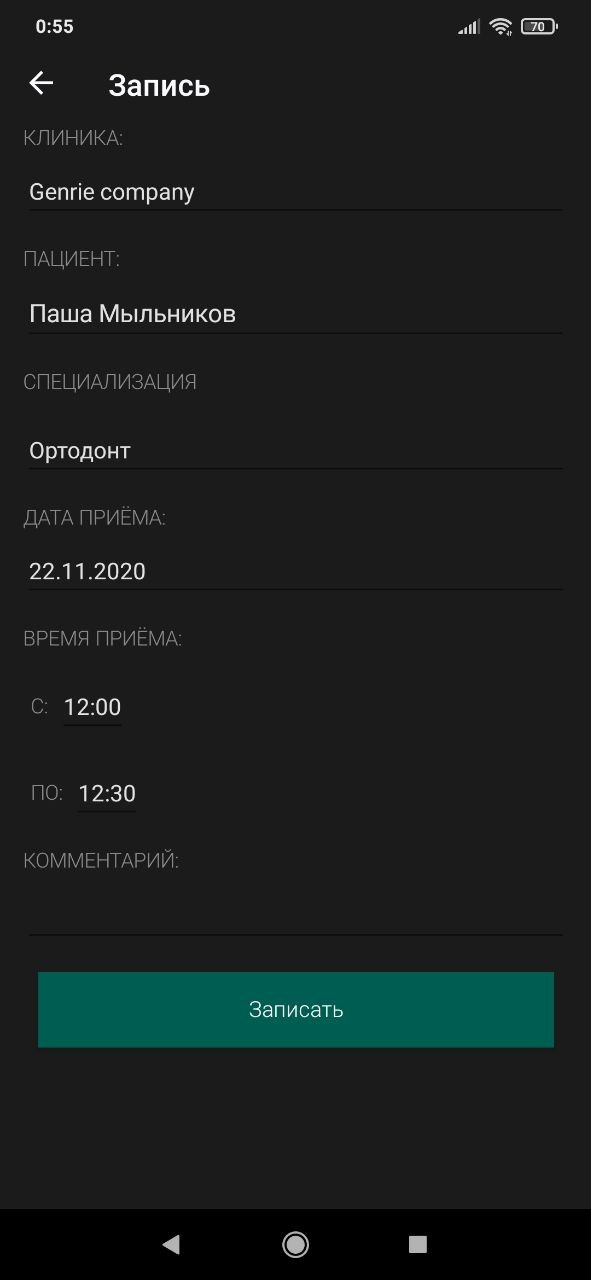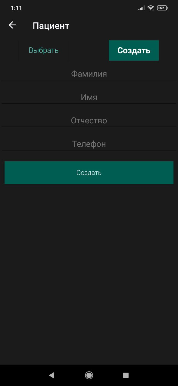 Из расписания можно записать на приём как пациента с карточкой, так и нового пациента без карточки. Чтобы записать вторичного пациента - нажмите при записи на строку «пациент» и выберете из списка нужного,а чтобы записать нового пациента — нажмите на строку «пациент», затем «Создать».