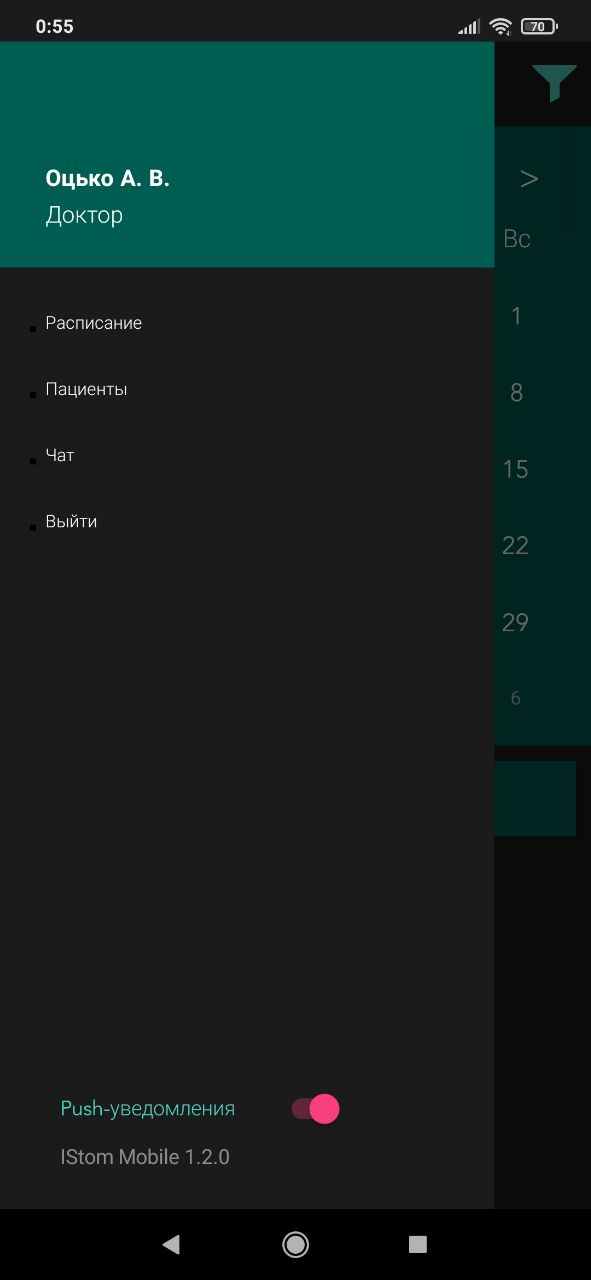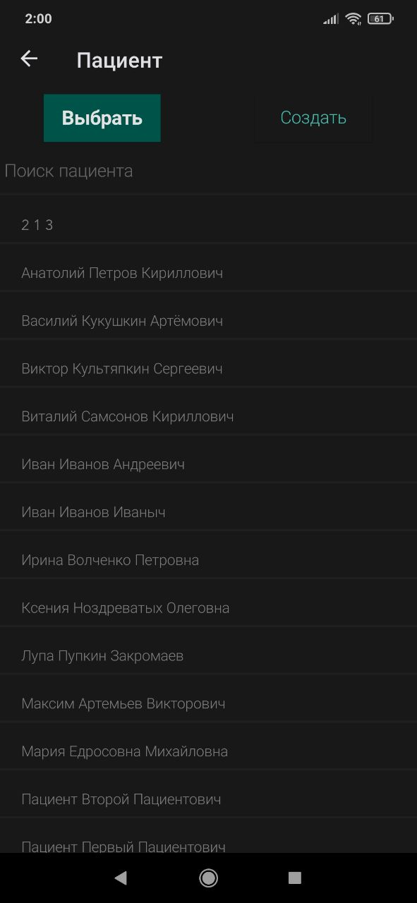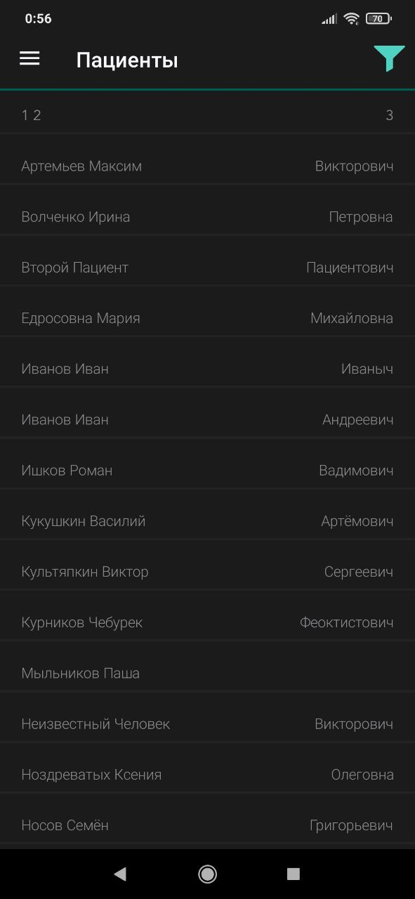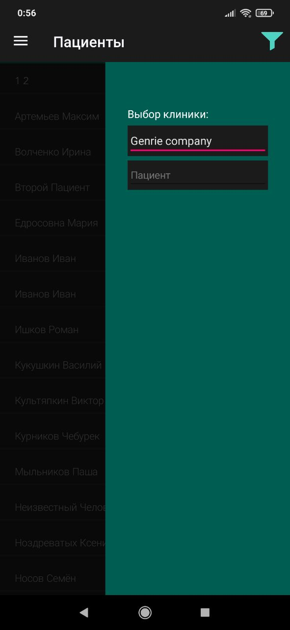 Список пациентов открывается через выдвижное меню в левом верхнем углу (три горизонтальные полоски), вкладка "Пациенты". В списке пациентов есть возможность поиска пациента, нажав на "воронку" в правом верхнем углу.