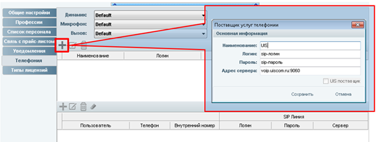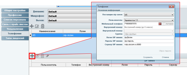 4. Следующим шагом добавляем запись Sip-линии. Указываем Поставщика sip связи, которого мы добавили в пункте 3. В поле «Пользователь» мы должны выбрать нужного пользователя программы iStom, за которым будет закреплена данная sip-линия. В поле «Мобильный телефон» указываем номер входящей линии подключенной к сервису UIS. Логин, пароль и сервер sip-линии указываем такие же как в пункте 3.