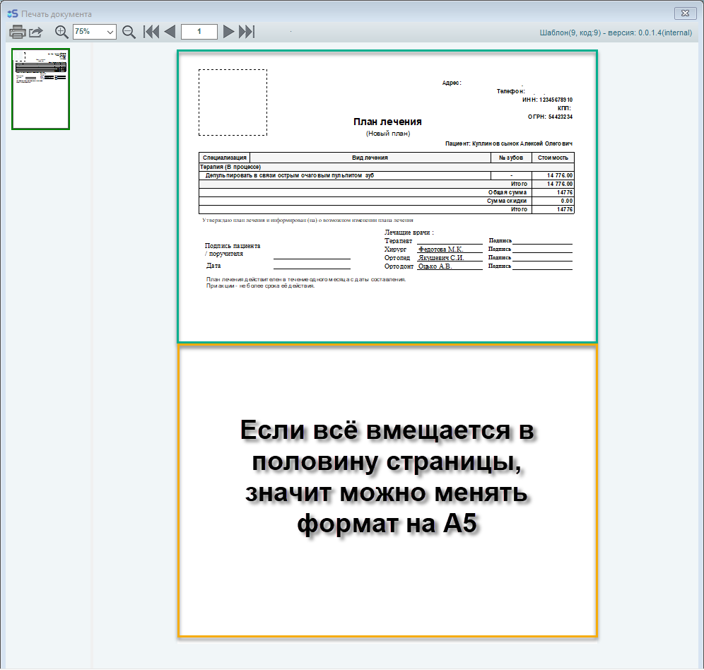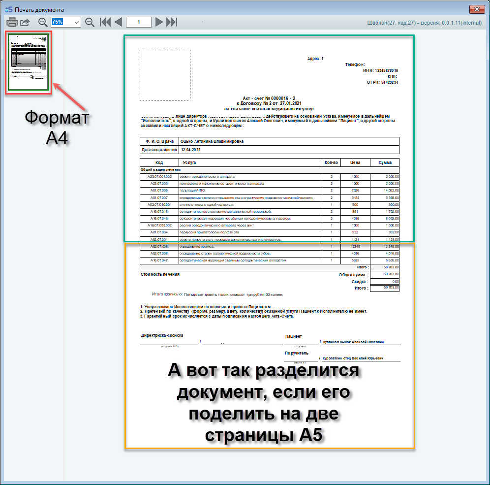 Пример:При формировании акта о выполненных работах у вас слишком много позиций и в половину листа А4 вы не укладываетесь, но хочется распечатать документ на А5, разделив его на две горизонтальные страницы формата А5 - у вас не получится распечатать документ корректно, так как шаблон документа не предусмотрен для переноса данных при изменении размеров документа.