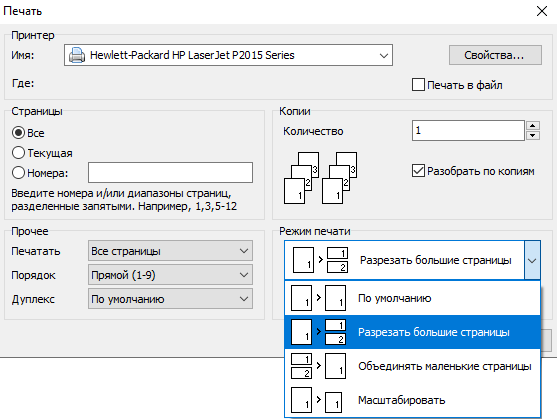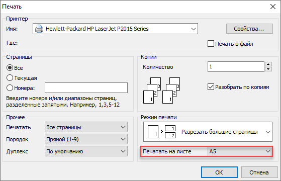 - Разрезать большие страницы - режим печати, при котором страницы А4, которые вы будете печатать в формат А5 будут делиться напополам. Помните о том, что если в вашем документе много информации, которая занимает больше половины страницы А4, при печати на А5 данные могут распечататься некорректно и какая-то строка может попасть в место раздела страницы.