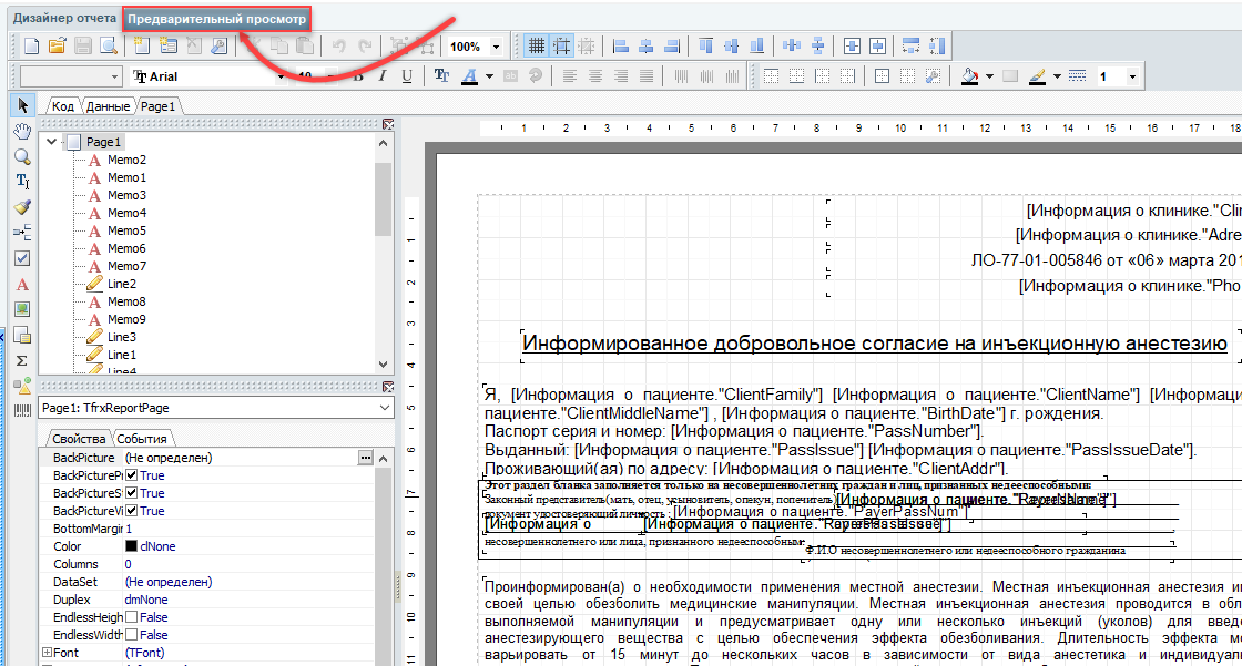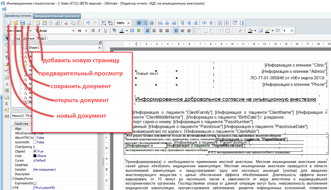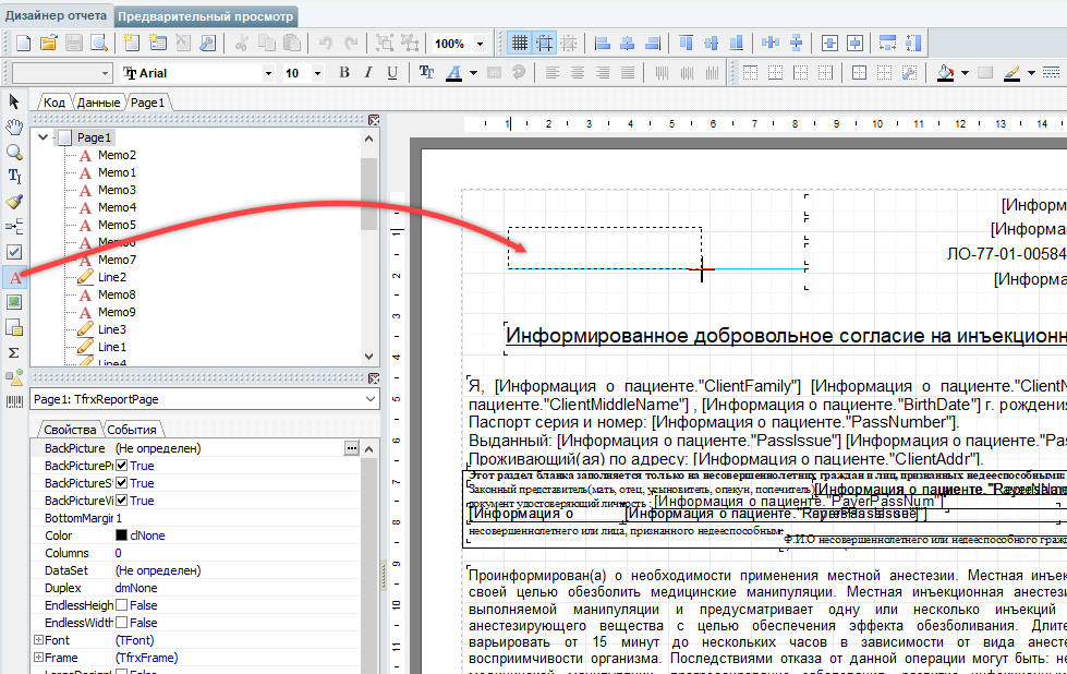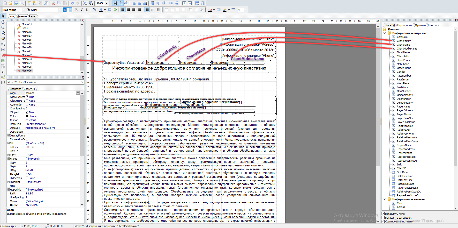 Поля БД информации о пациенте и информации о клинике сделаны интуитивно понятными для использования. (К примеру вы можете добавить текстовое поле "Здравствуйте, Уважаемый ---", а затем справа с панели "Поля БД" перетянуть Client Family, Client Name, Client MiddleName на лист поверх подчеркивания, чтобы информация из базы данных автоматически вставлялась поверх оставленного нами в тексте места. В таком случае мы получим готовую строку с текстом, в которую автоматически будет вставляться ФИО пациента.)