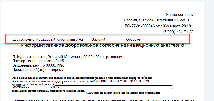 Поля БД предназначены для того, чтобы текст документа для каждого пациента был разным, а именно ФИО, дата рождения и прочая личная информация.
