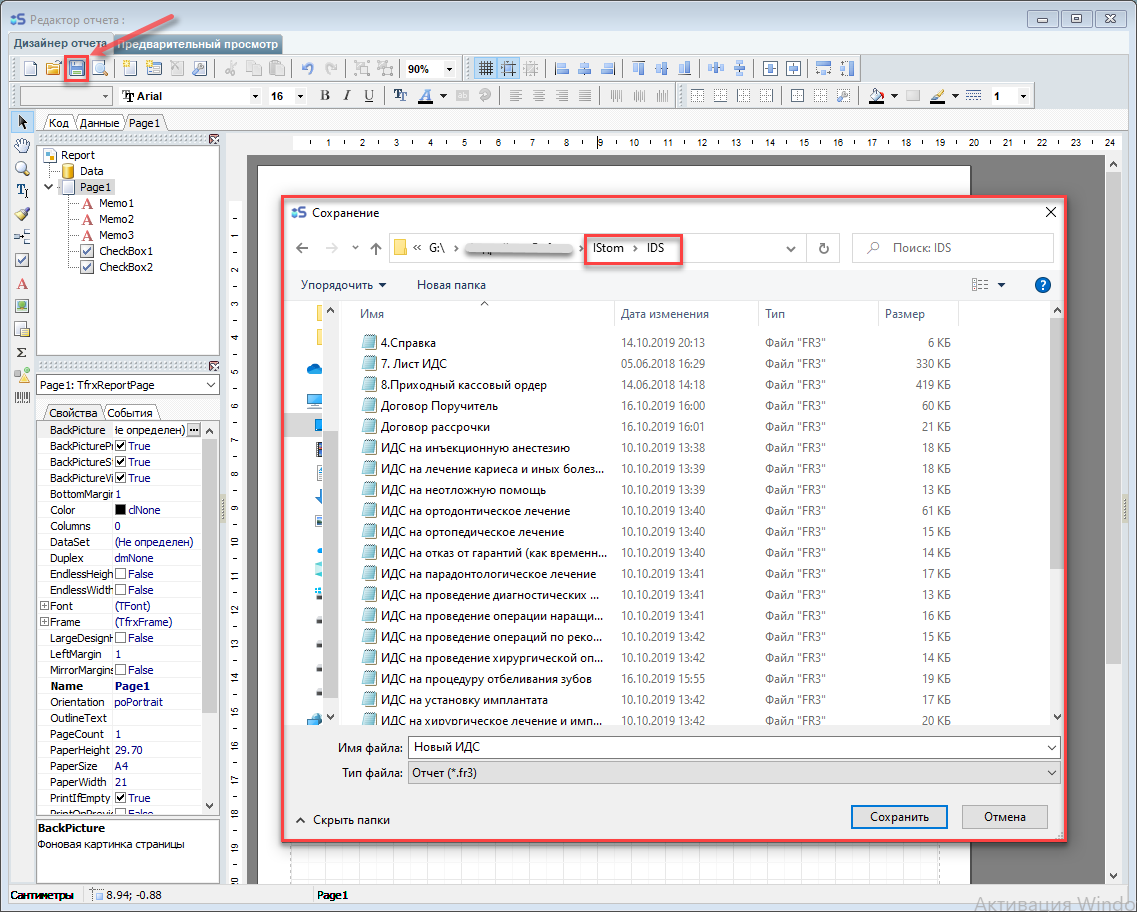 После того, как ваш документ будет готов - нажимаем "сохранить" и указываем папку для сохранения ......../IStom/IDS :