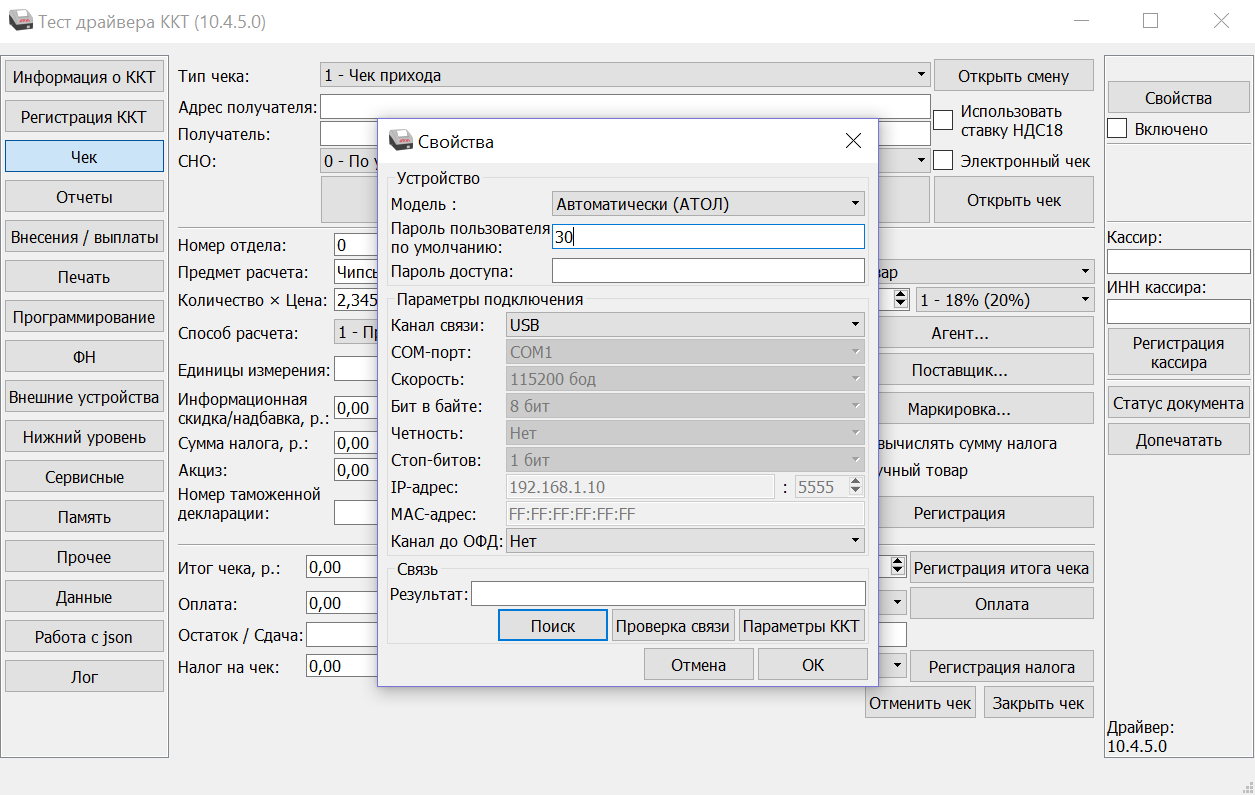 - После установки драйвера нужно запустить приложение АТОЛ - Тест драйвера ККТ.