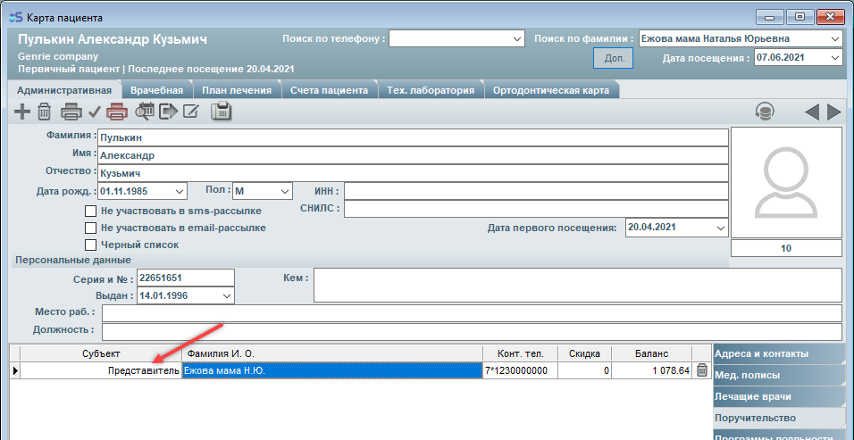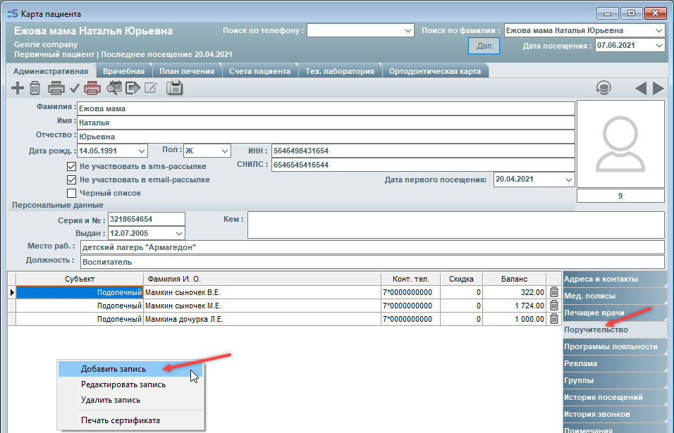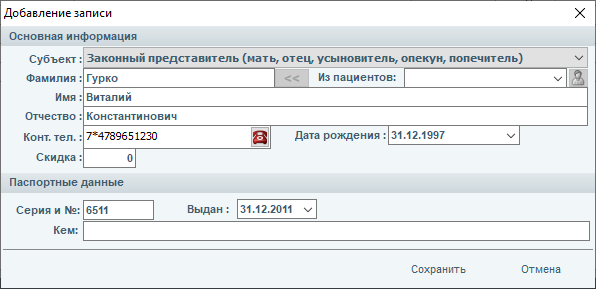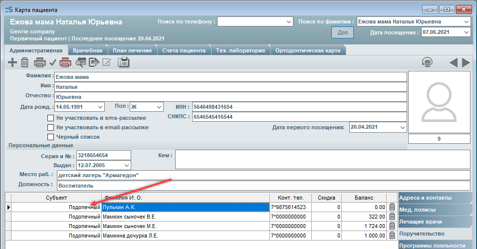 При добавлении записи обращайте внимание на значение в поле "Субъект". Значение в этом поле указывает на то, кем является для пациента данный родственник (подопечный или представитель).
