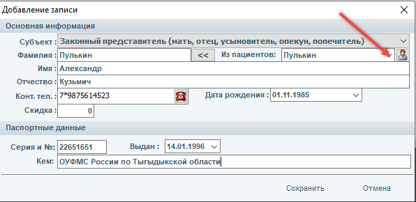 - В карту пациента вносится родственник, у которого нет карты (просто заполняем поля и сохраняем).