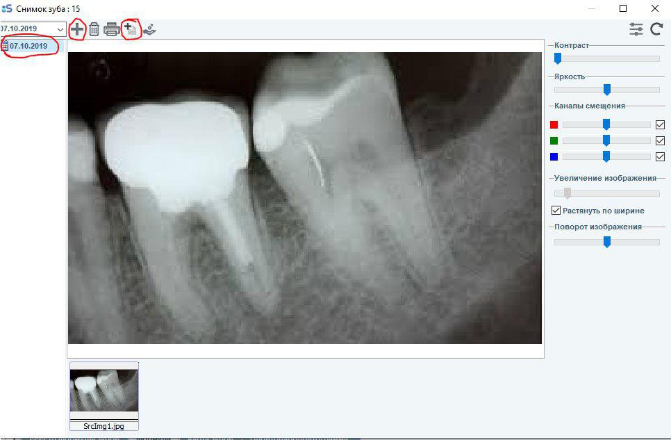 Для добавления снимков необходимо перейти в раздел "Зубная формула" в меню "Карта пациента", нажать на зуб и перетянуть необходимые снимки. Также есть возможность добавить дату, проводить поиск по снимкам и добавлять нужный снимок из выбранного. в меню поиска