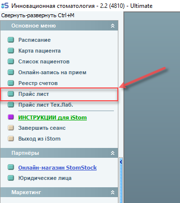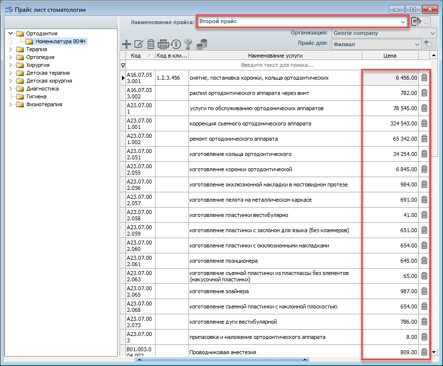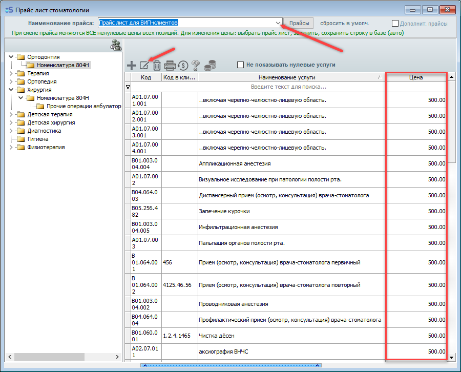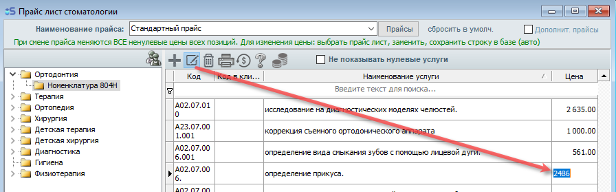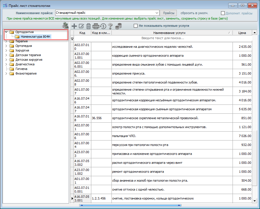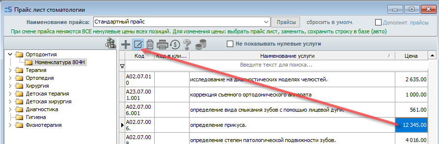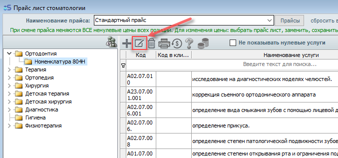 Откройте прайс-лист, затем откройте тот раздел прайс-листа, в котором необходимо внести изменения (к примеру - Ортодонтия(Номенклатура 804Н)).