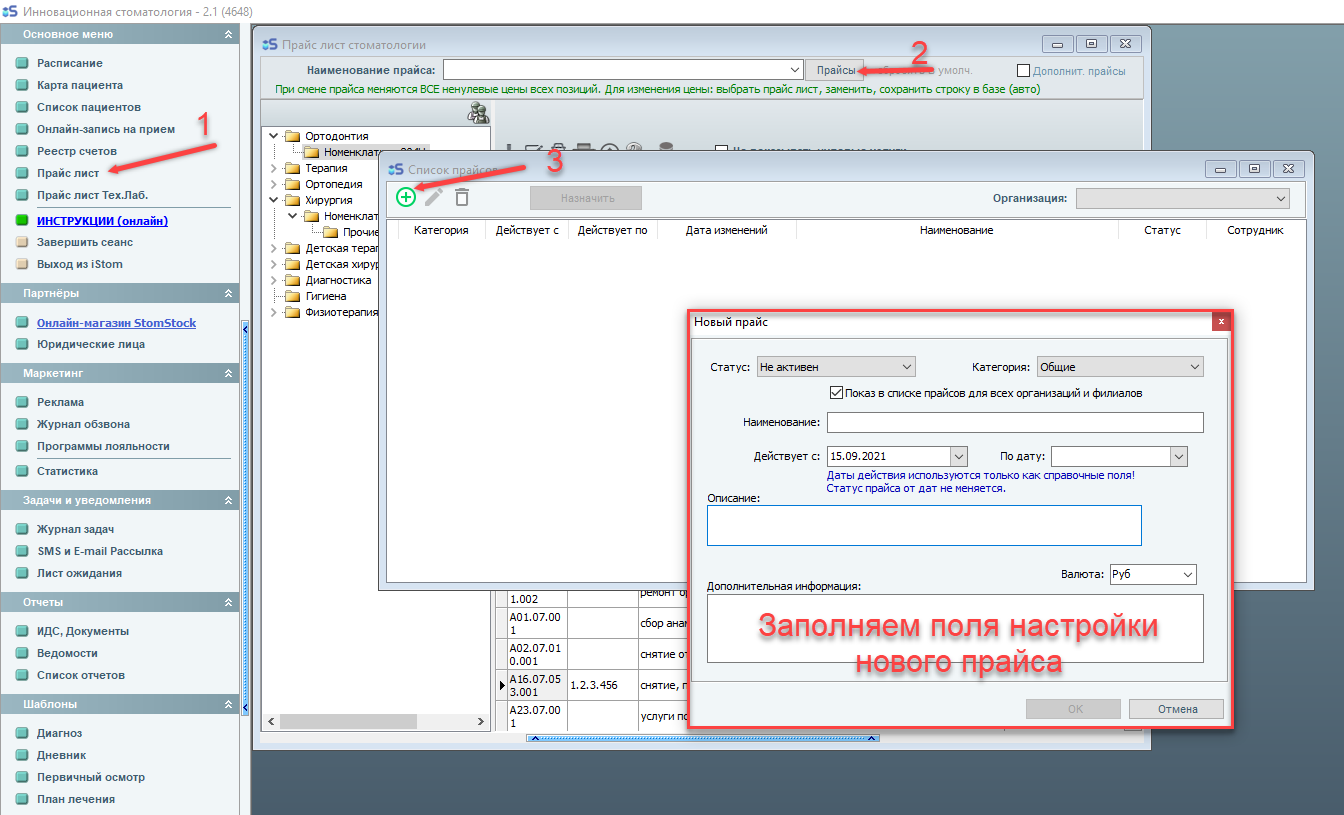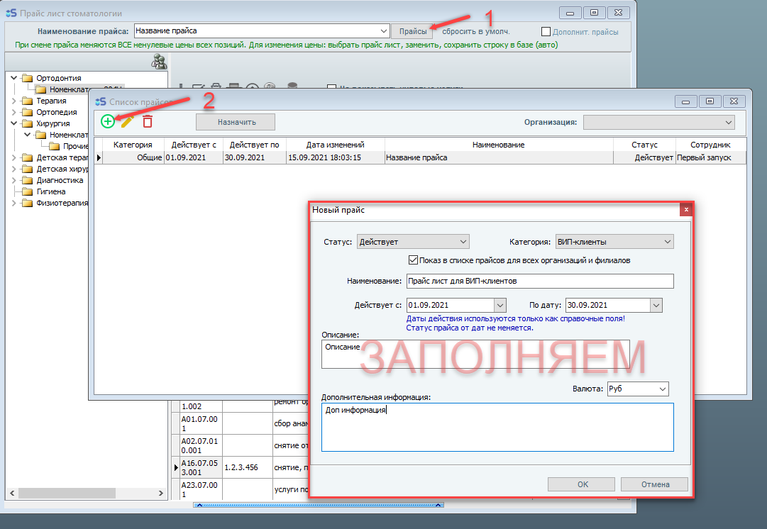 Теперь в окне "Прайс-лист стоматологии", в строке "Наименование прайса" отображается лишь один прайс-лист, поэтому необходимо добавить еще один прайс-лист.
