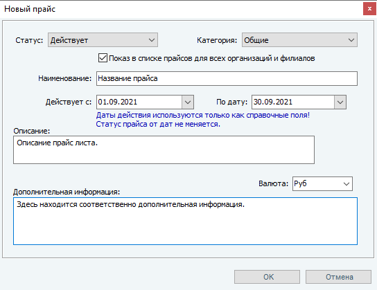 2. Заполняем поля настройки нового прайс-листа: