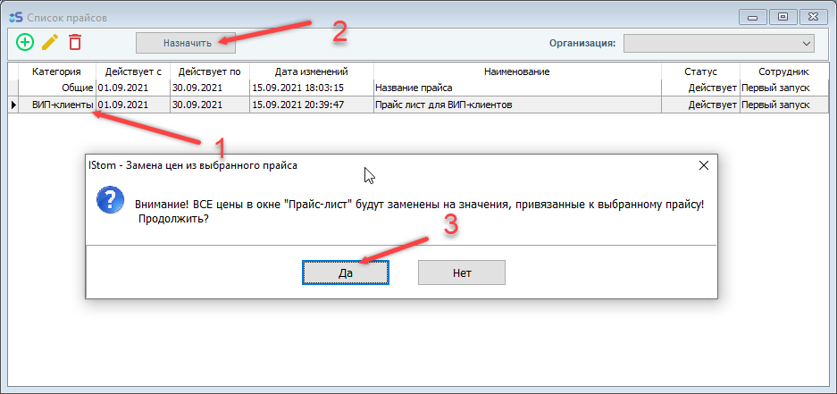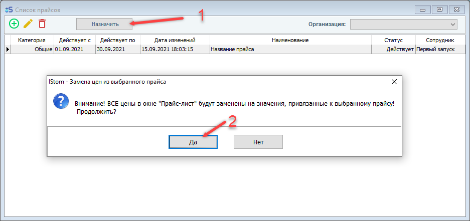 3. Нажимаем "Назначить" на верхней панели, а затем ОК (Кнопка "Назначить" предназначена для того, чтобы выбрать прайс, который будет отображаться при открытии прайс-листов из основного меню)